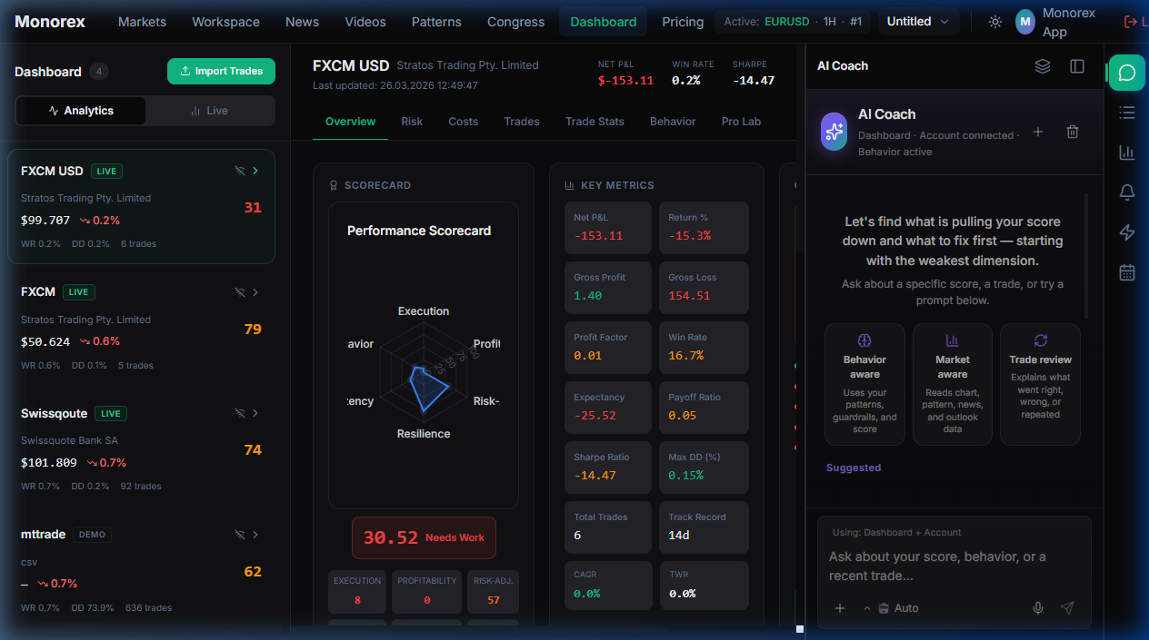 AI Coach is more useful when it can see the same context you are already working with. In Monorex, coaching is connected to scorecards, setups, market context, and watchlist signals — so the conversation can start from real workflow context instead of a blank prompt box.