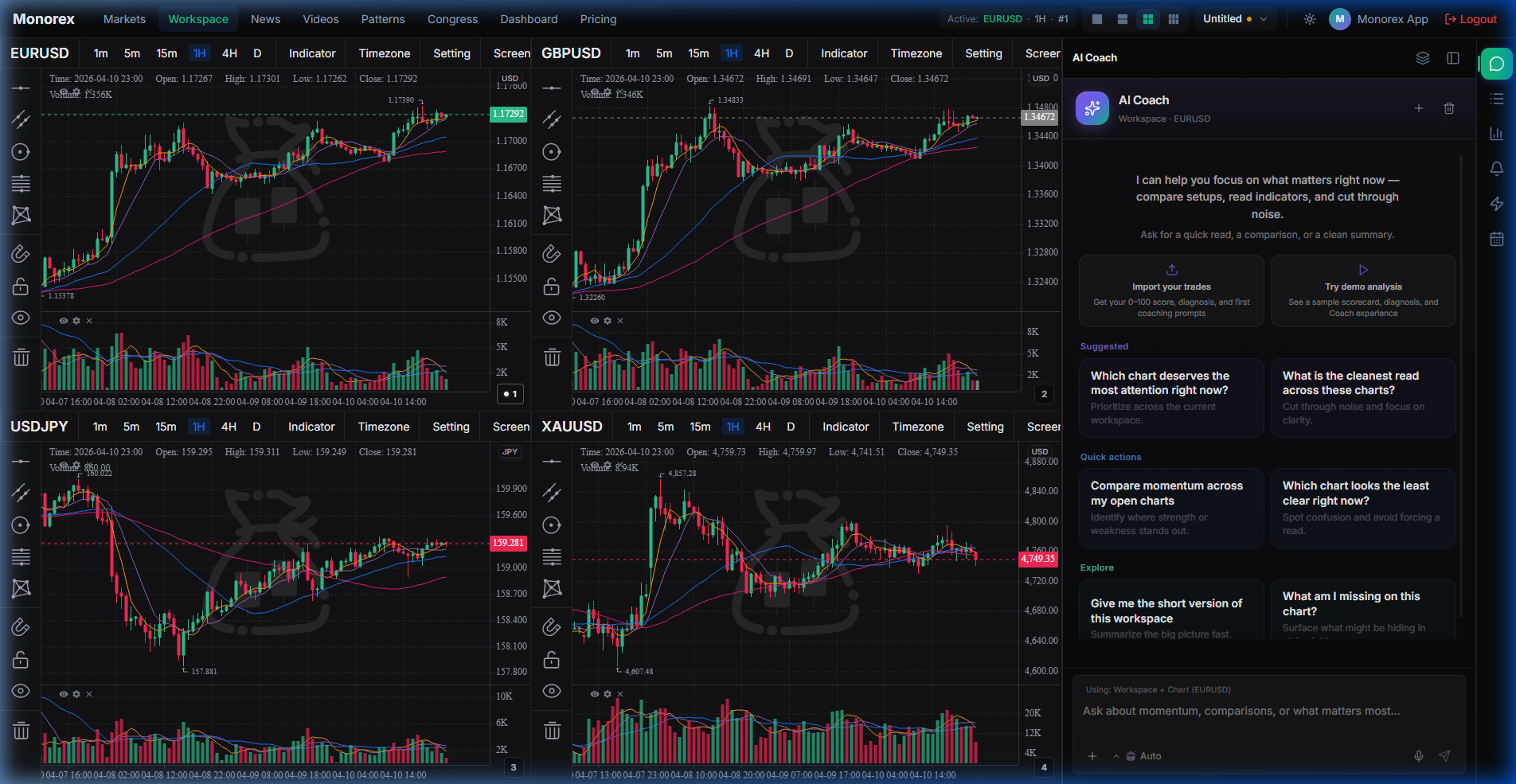 Monorex is designed for traders who operate under pressure and want a cleaner workflow for context, setup discovery, alerts, and behavioral review.