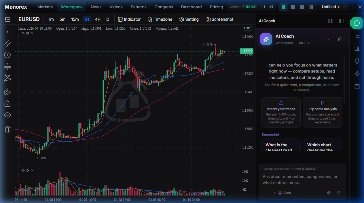 Charts are useful, but active trading workflows rarely depend on charts alone. Monorex connects chart context with alerts, patterns, news, video insights, and coaching so your workflow stays intact from observation to interpretation.